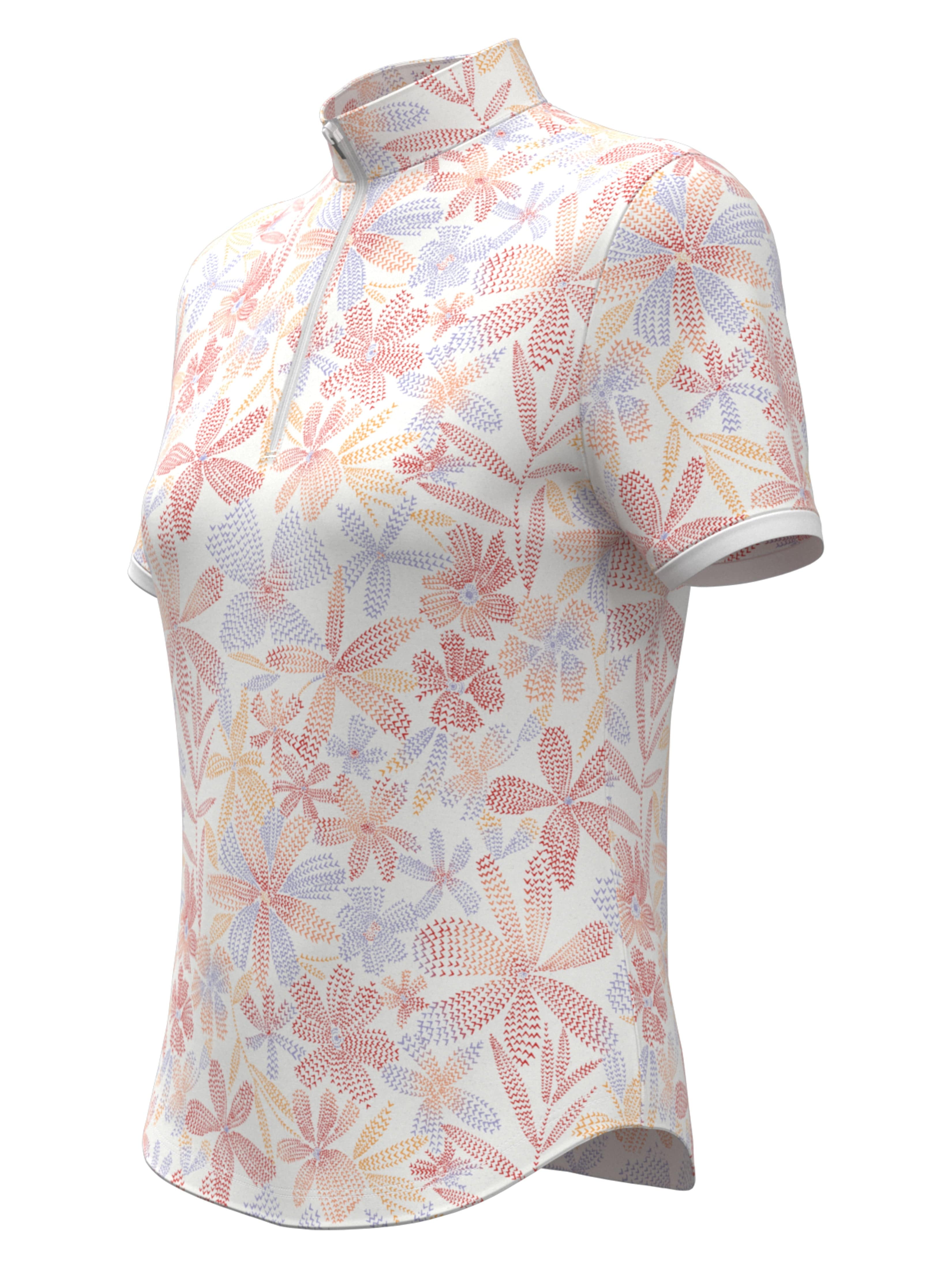 For smart style on the course and beyond, choose this short sleeve golf shirt from Callaway. This women's golf shirt has a polo collar and a front zipper closure for a smart, sporty look that's just right for a round of golf or a casual brunch. The abstract floral pattern adds a unique touch while the moisture-wicking technology helps you feel cool and dry before and after the game.