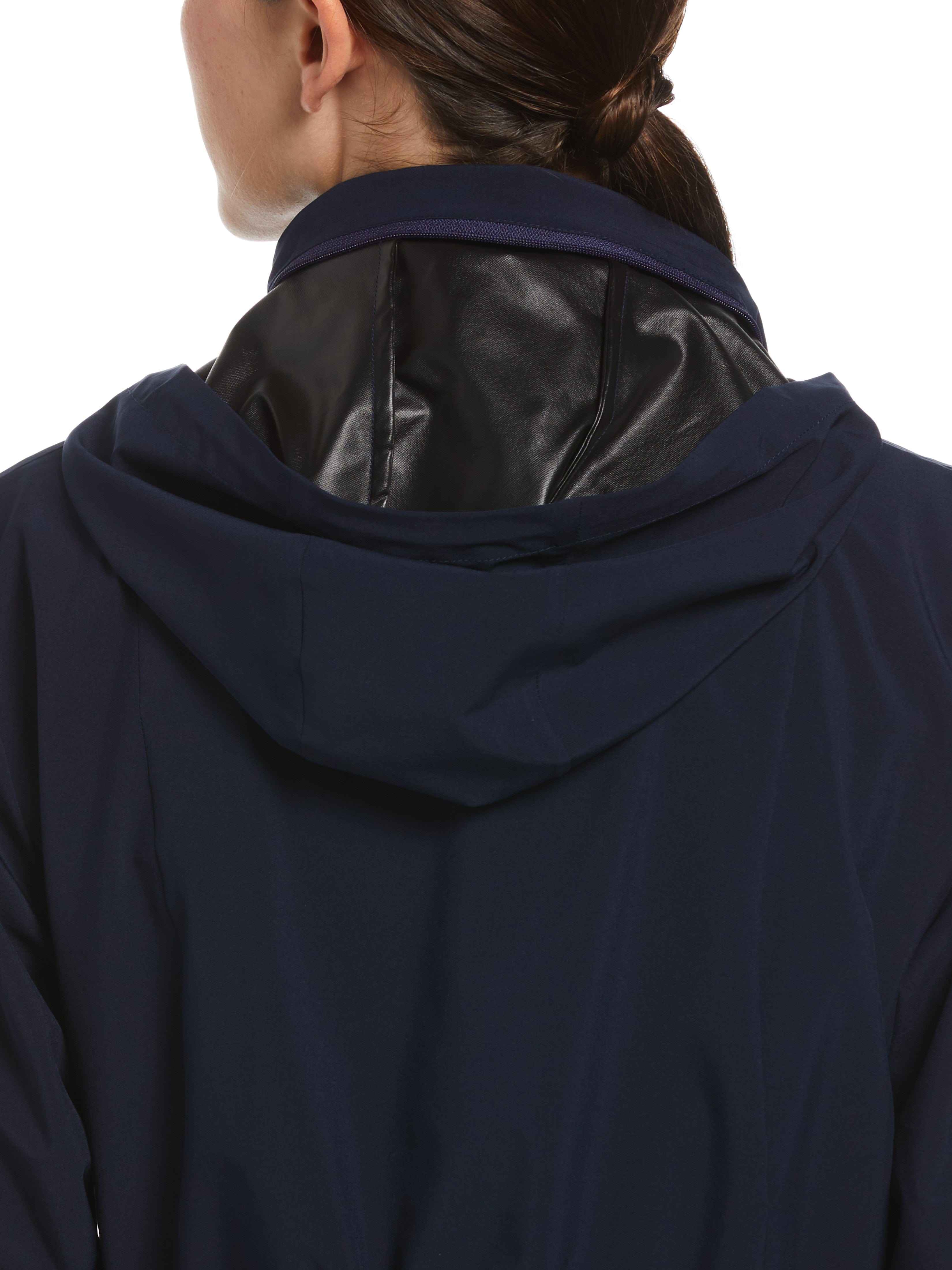 Great for cool and rainy days on the golf course, this practical women’s jacket from Callaway is wind and water resistant to help keep you protected from the elements. Built-in sun protection helps to guard against damaging UV rays when the skies are clear, while a high mock collar and packable hood extend protection up to your head and neck when the rain comes. A hint of stretch in the fabric and Swing Tech™ technology keep the women’s golf jacket comfortable to play in, providing the freedom of motion you need to make each shot with your best form. The fabric is crafted with a tight plain weave pattern that stands up well to everyday wear and tear.