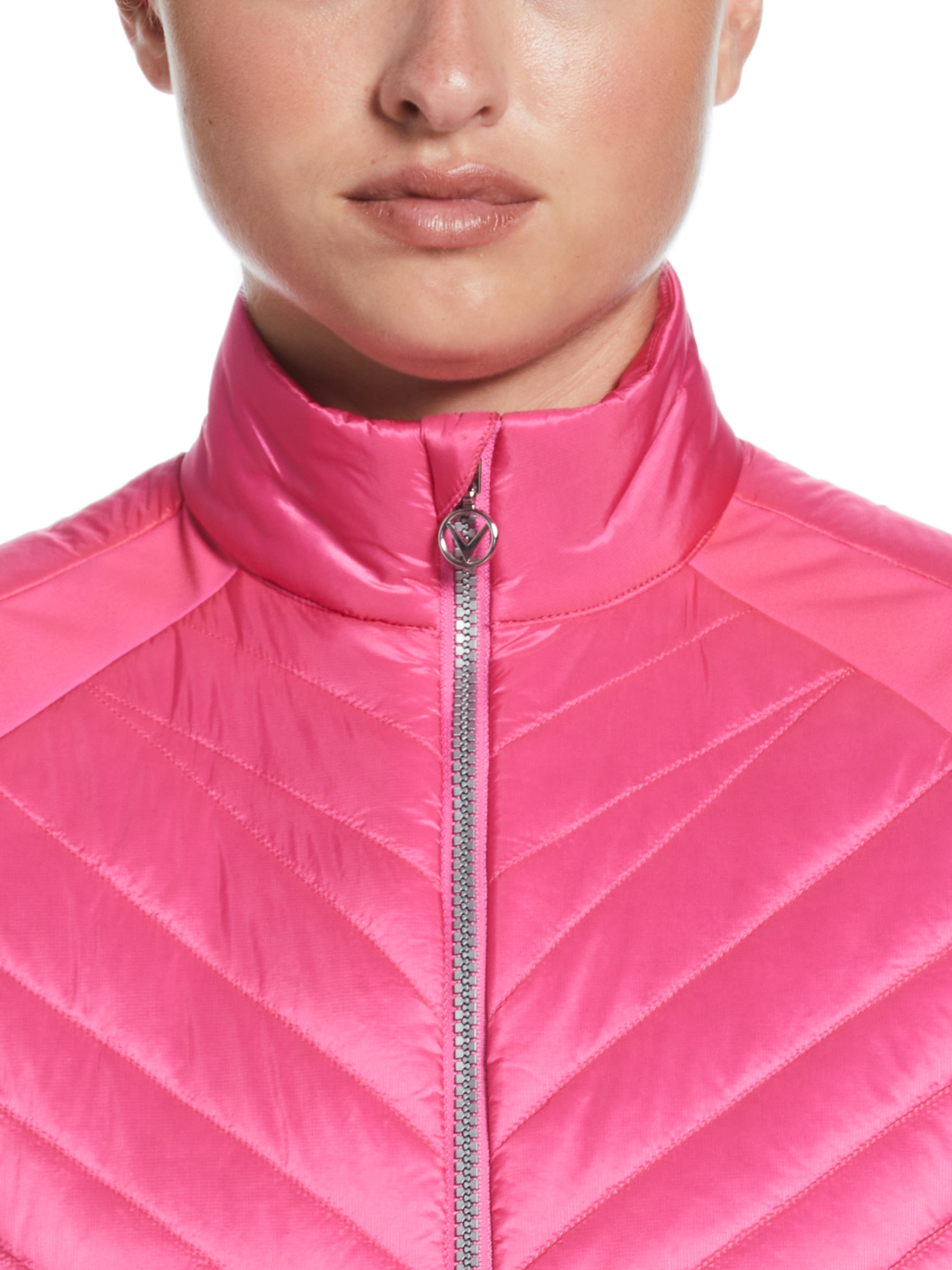 This Callaway women's golf vest is a fashionable a functional piece of golf outerwear that's just right for those cooler rounds. Boasting thermal fabric for warmth with a chevron-quilted design, this warm golf vest offers both practicality and style. It also includes Swing Tech™ for a full range of motion and added stretch for comfort and easy movement. Plus, the water-repellant material lets you play in all conditions.